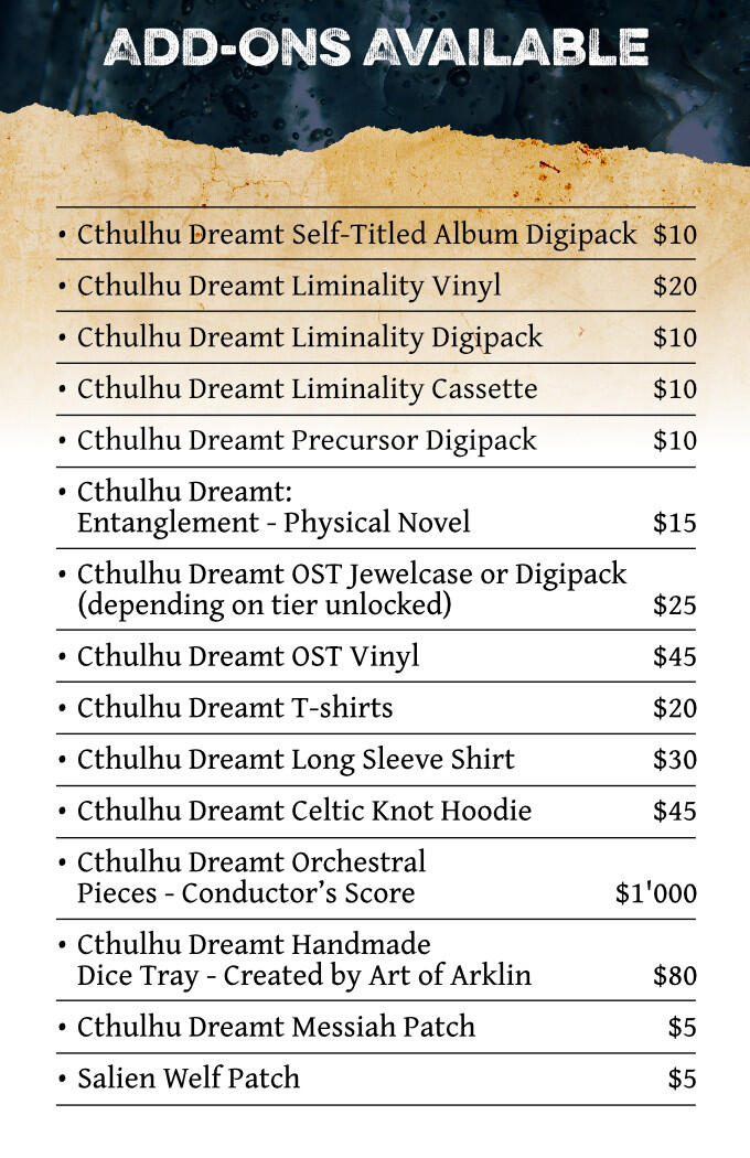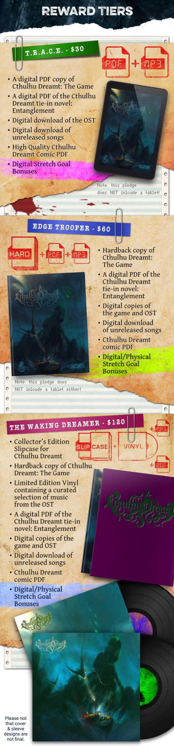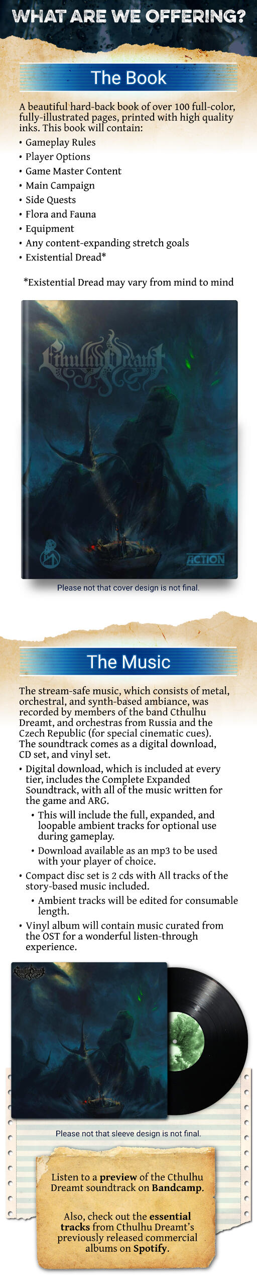 The accompanying Cthulhu Dreamt soundtrack contains over 33 original songs, and over two hours of music highlighting cinematic moments of the story. It also includes ambient and background music to underscore the different elements of the campaign.As you read through the game book, you will find QR codes that will link to a song written for that part of the story, making it easy for you and your fellow players to create memorable experiences as you read and play through the campaign. Music is a magic of its own, and when combined with the role-playing experience, can take the immersion even deeper.The music, which consists of metal, orchestral, and synth-based music, was recorded by orchestras around the world, and by progressive metal band Cthulhu Dreamt, fronted by Reed Reimer. The soundtrack will be available as a digital download, CD set, and vinyl set.