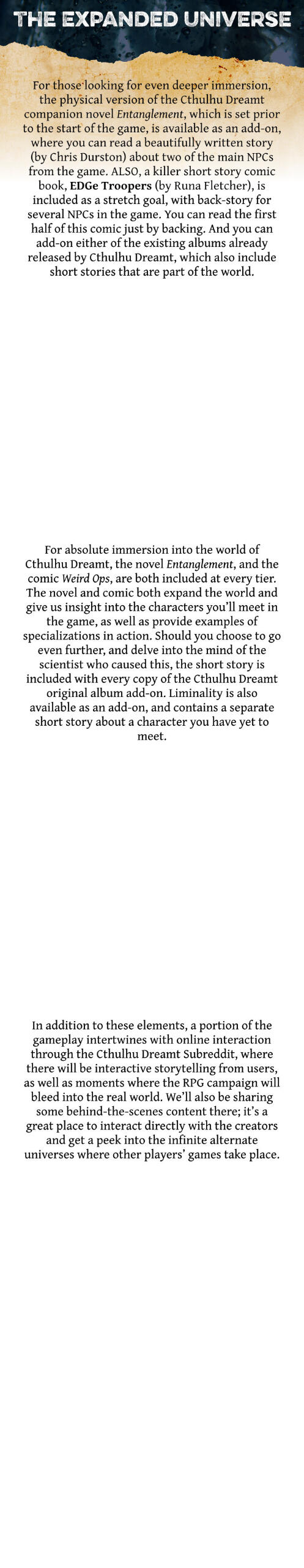 Para aquellos que buscan adentrarse en el universo de esta historia, la precuela de Cthulhu Dreamt, Entanglement estará disponible como un add-on. Escrito magníficamente por Chris Durston, este libro sigue a dos de los NPCs principales del RPG, dando una visión más profunda del mundo que explorarás en el juego.Llevado al medio del océano por un sueño de una mujer desesperada, el físico de partículas Simon Greerson y sus compañeros de barco se encuentran atrapados en una isla donde criaturas sobrenaturales cobran vida.Mientras tanto, la colega de Simon, Sheena, descubre que hay gente que haría cualquier cosa por dinero. Incluso cuando el fin del mundo es simplemente otro gran proyecto para generar riquezas, salvar a su amigo podría no ser una prioridad para sus nuevos jefes corporativos.